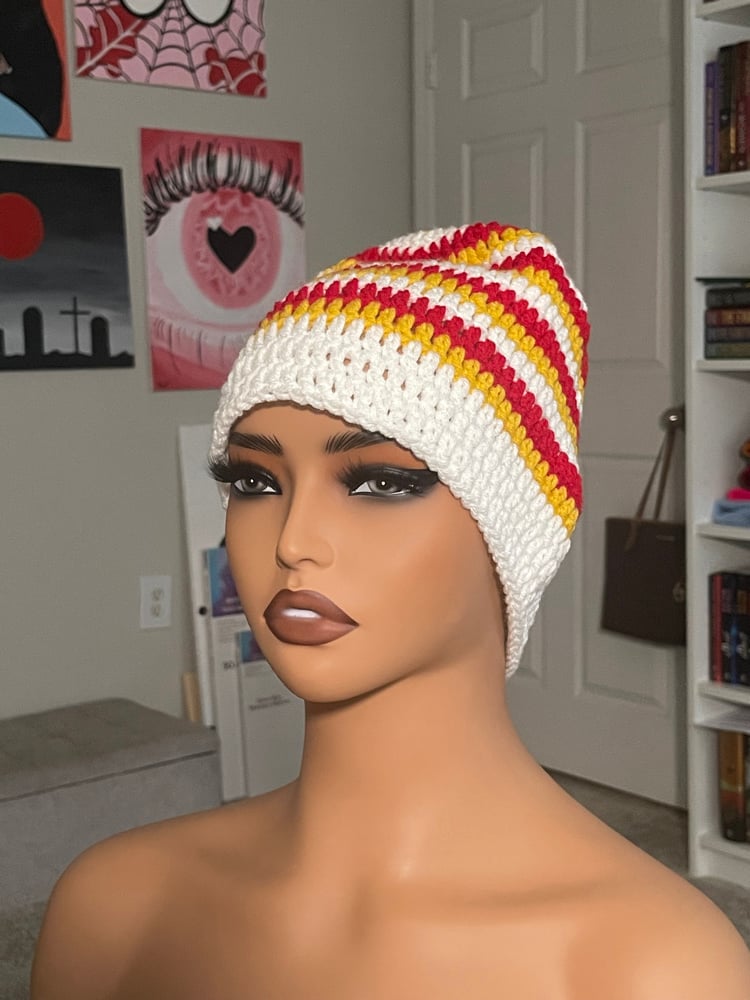 Handcrafted with care using soft, high-quality yarn, this beanie offers warmth, durability, and a clean, classic look inspired by the iconic Kansas City Chiefs colors. Whether you’re heading to the stadium or repping your team around town, this beanie adds the perfect finishing touch to your outfit.